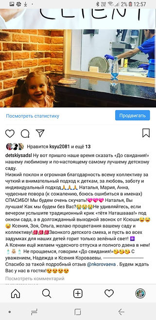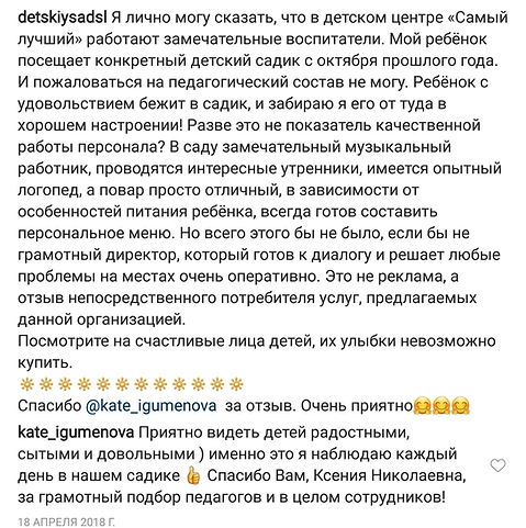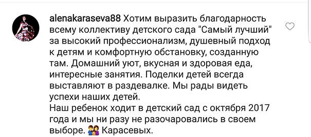«В «Самом лучшем» детском центре чудесная атмосфера тепла и уюта. Дети приходят будто к себе домой и не хотят уходить. Мой ребенок наконец-то стал слушать детские песни, петь. Дома рассказывает считалки и учит меня зарядке. Воспитатели чуткие и спокойные. Что очень ценно, так как все мы живем в нервном напряжении»